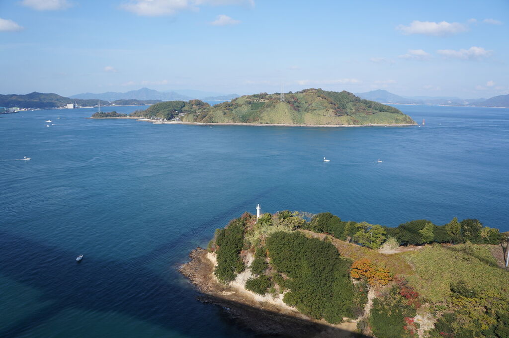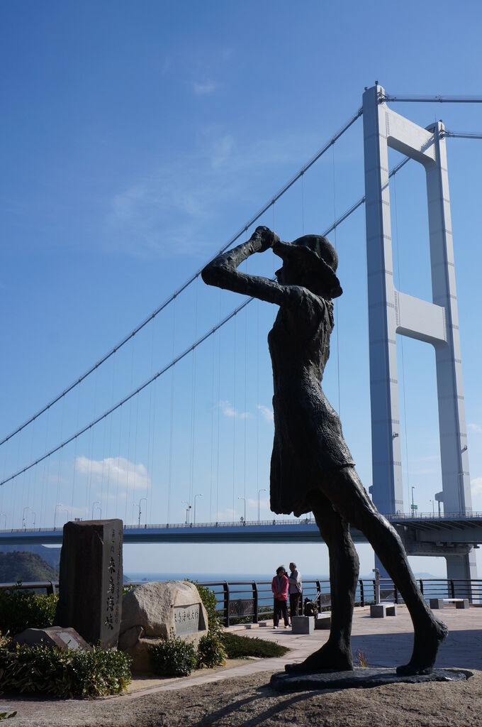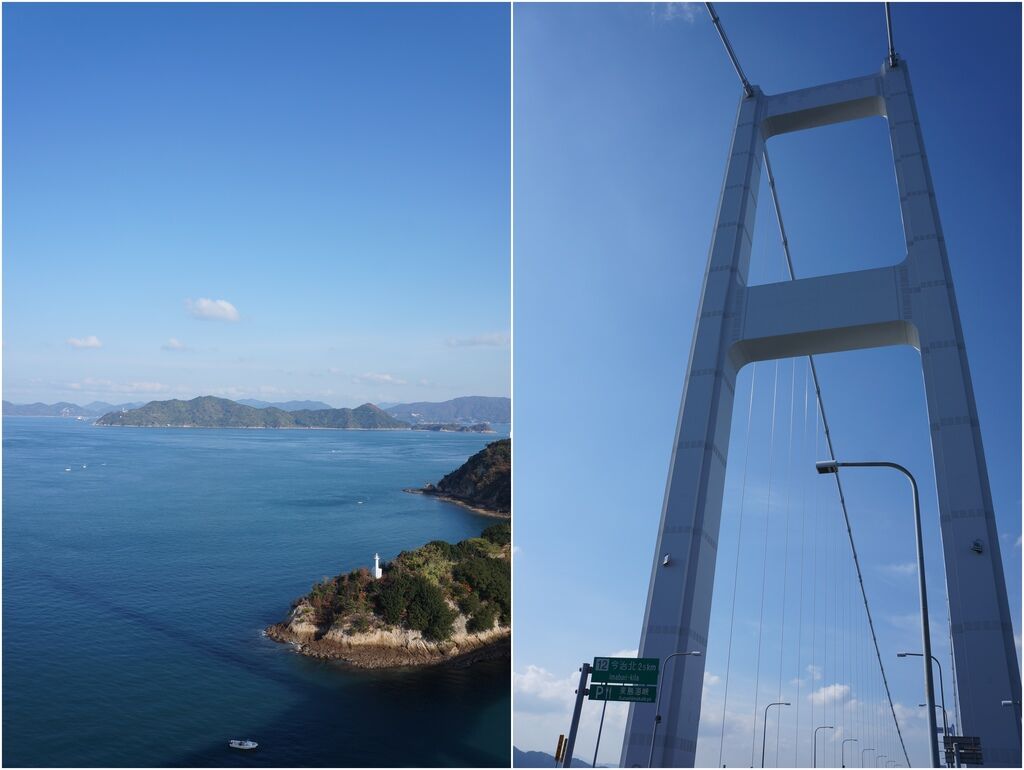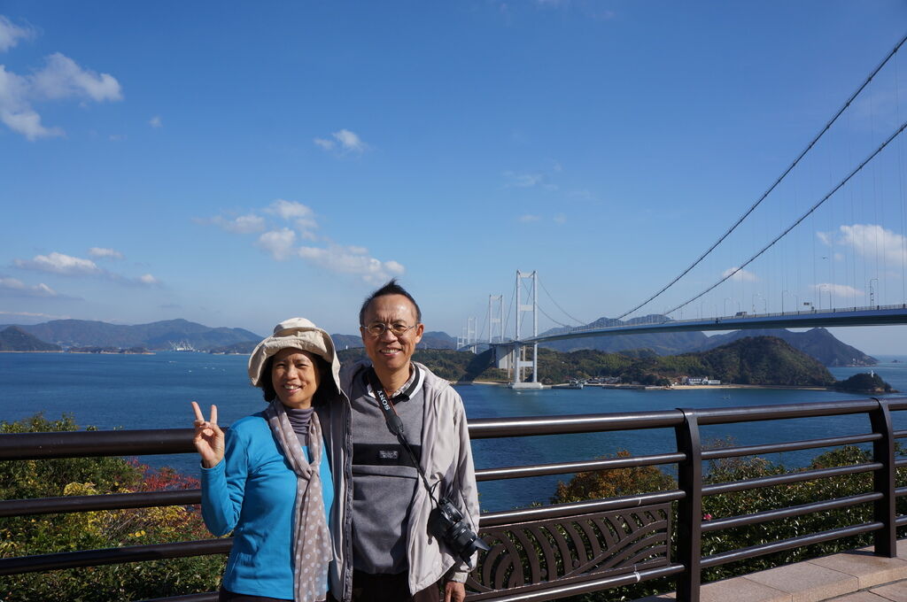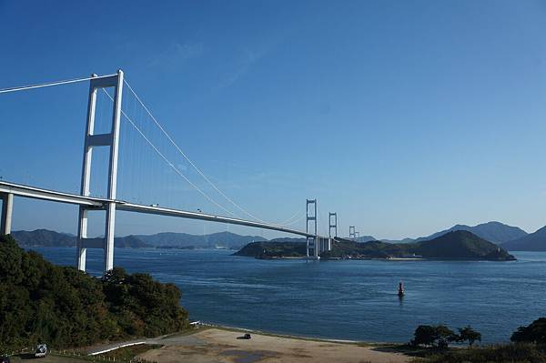 折返回道陸地後, 我們往上走一點, 約 20 min, 來到糸山公園的來島海峽展望台從遠眺來島大橋