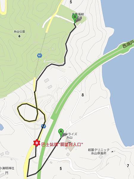 - 與"來島展望台巴士站牌", "サンライズ糸山" 相對位置 (取自google map link)