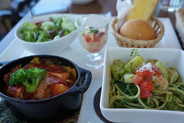 可以選配兩樣主菜, 附麵包, 沙拉, 好吃, 還可以一邊賞海景