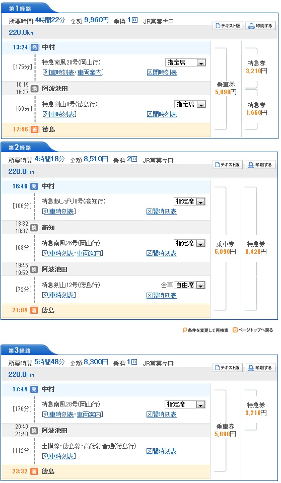 比如說我是下午要從中村去德島, 查出來只有三個班次: 13:24, 16:46, 17:44 (2012/11資料)