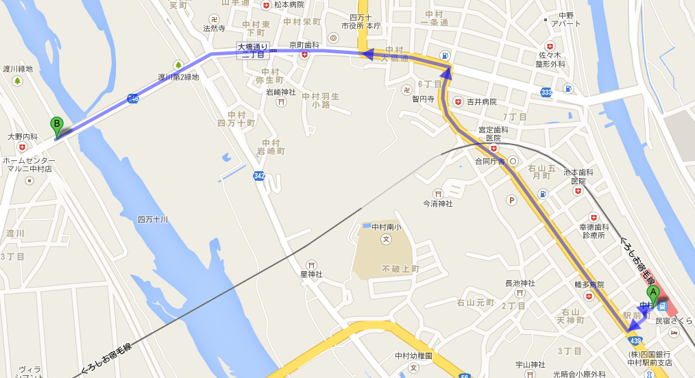 簡單來說, 要從"中村站"(A)騎過"赤鐵橋"到對岸(B)