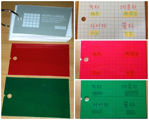 使用示範: 右上: 單字卡, 右中: 單字卡配紅卡, 右下: 單字卡配綠卡.