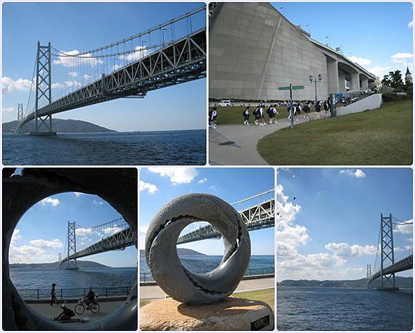 舞子公園的地標"夢レンズ", 很有趣味的鏤空石雕, 從中望去, 櫬著明石海峽大橋.