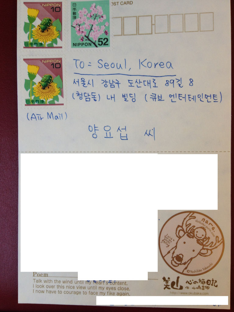 每張明信片右下角都貼了鹿與大佛的貼紙 (奈良門前市場買的, 燙金的好有質感^^)