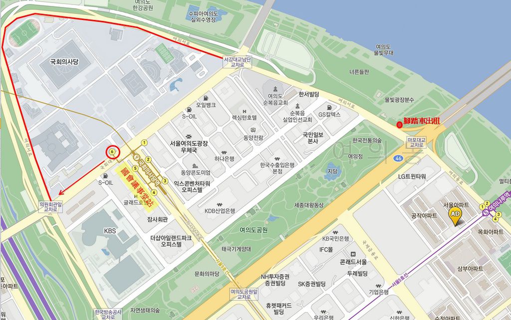 國會議事堂站(국회의사당역)6號出口左轉,沿著國會外圍走就會抵達入口。